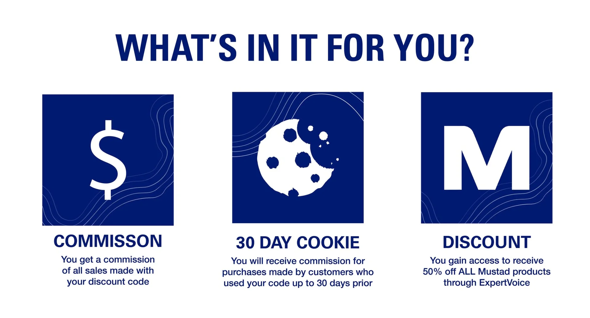 If you are selected, you will be set up with a custom discount code to distribute to your following. You will receive a commission based on all sales generated with your code, which is a standard 20% discount on all products and can go as high as 30% off during peak seasons. You will also become a member of Expert Voice and gain access to personally receive 50% off all Mustad products.